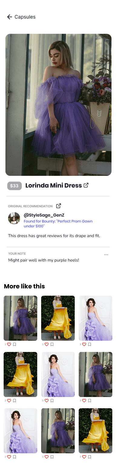 Capsules are built for fashion discovery and curation. Every item inside is tied to a real recommendation or bounty, so users can track its source, context, and follow up with the person who posted it.