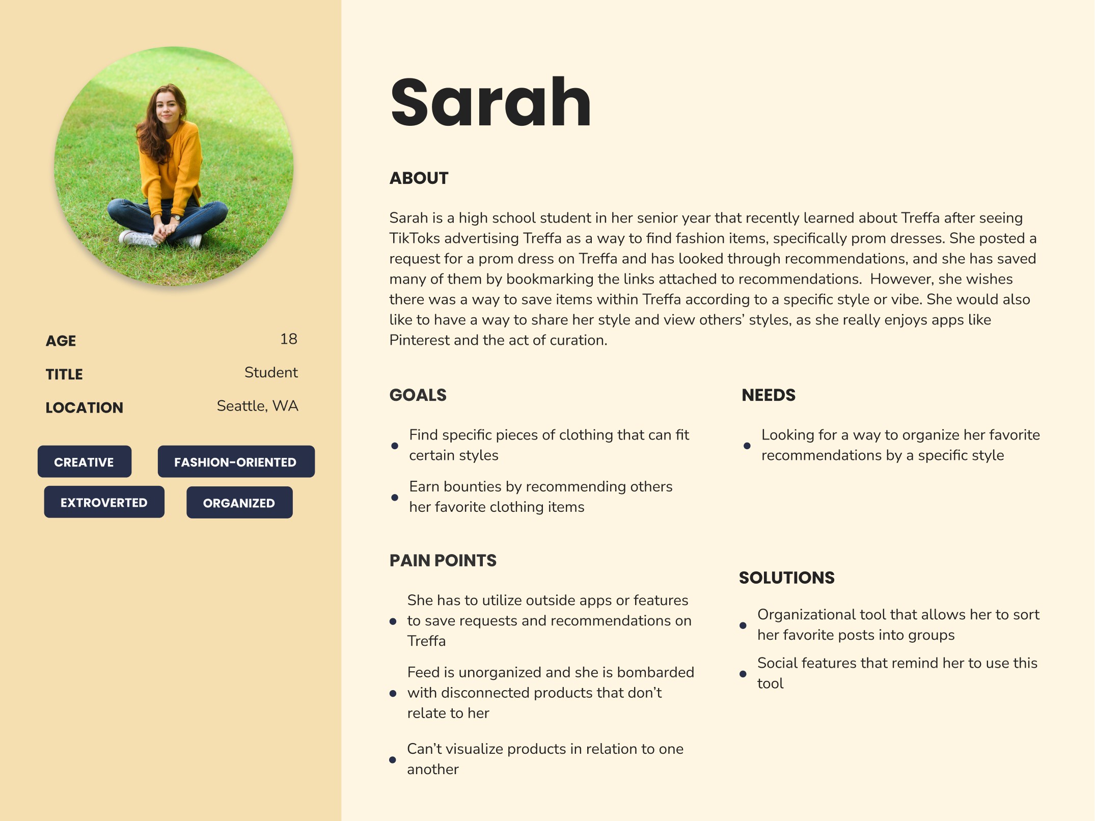 Throughout the process, I consulted with Treffa's first user to determine the pain points of Treffa's target users. I created a user persona to help guide my features for Treffa and my design.