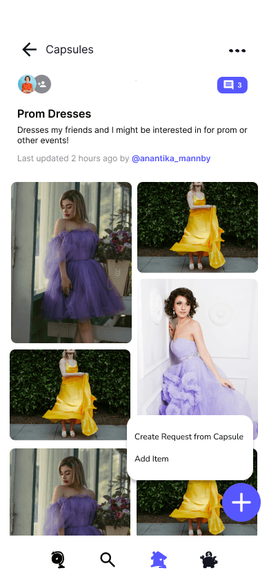 Gen Z audience doesn't just buy a standalone piece of clothing, they shop to fulfill a specific vibe or aesthetic. Being able to attach a capsule to a bounty/request turns shopping collaborative and a hunt to find the item that will match the user's capsule/style.